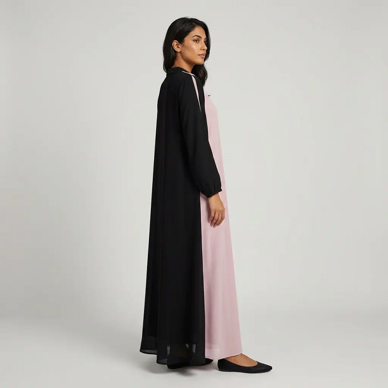عباءة طويلة باللونين الوردي والأسود، مزينة بحجاب وأحجار الراين الرقيقة | أزياء إسلامية أنيقة من دبي - هانا كلوزينج