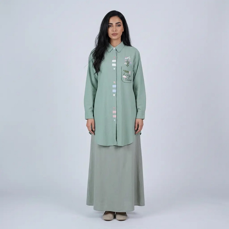 - Low-saturation sage green Islamic Outfit, soft and flattering on all skin tones, with a calm and artistic vibe.
