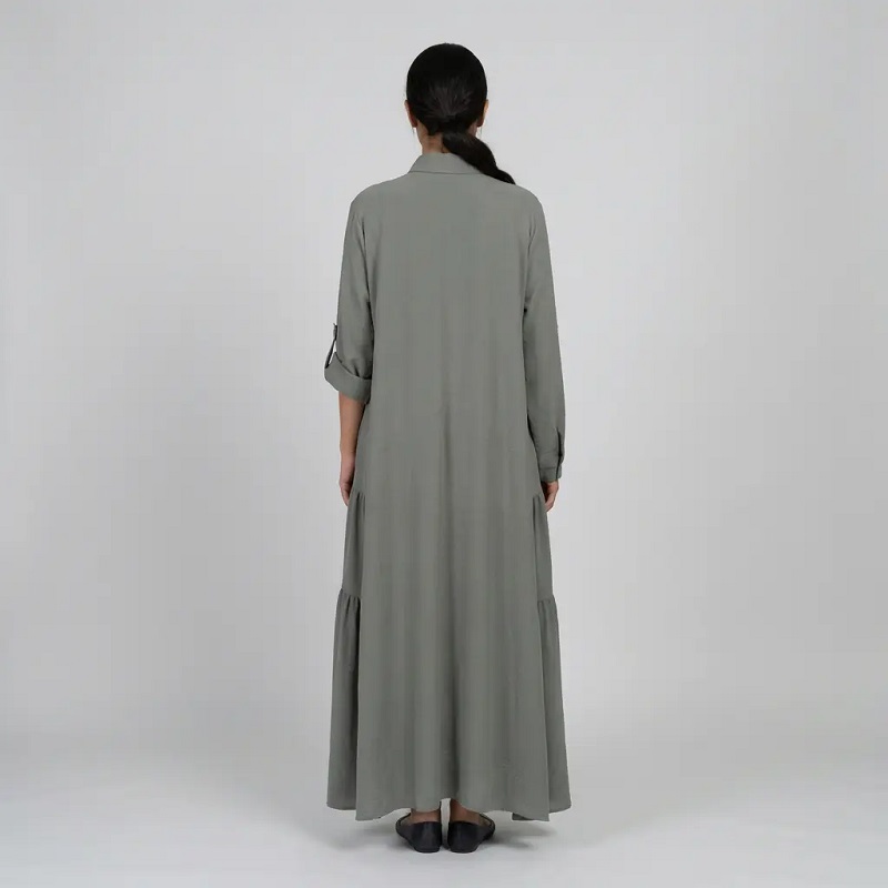 Sage Green Collared Roll Tab Sleeve Tiered Maxi Abaya | Dubai Muslim Casual Gown, Abayas - Hanna Clothes HC-7733
