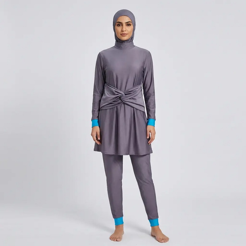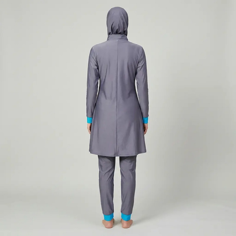 - Main grey tone with bright blue cuffs/ankles Muslim Burkini, stylish and eye-catching, adding sporty vitality while breaking monotony.