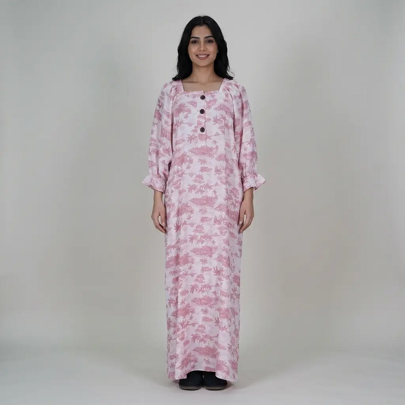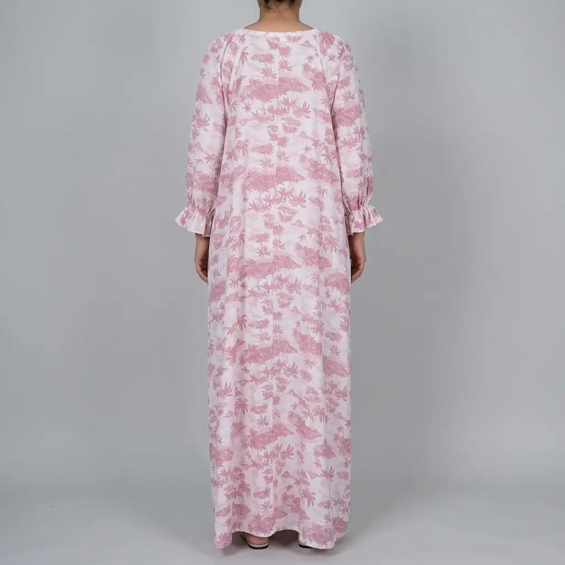 فستان طويل بتصميم إسلامي، بياقة مربعة وأكمام منفوخة، بنقشة أشجار النخيل باللونين الوردي والأبيض، مثالي لقضاء عطلة إسلامية في دبي - هانا أباريل